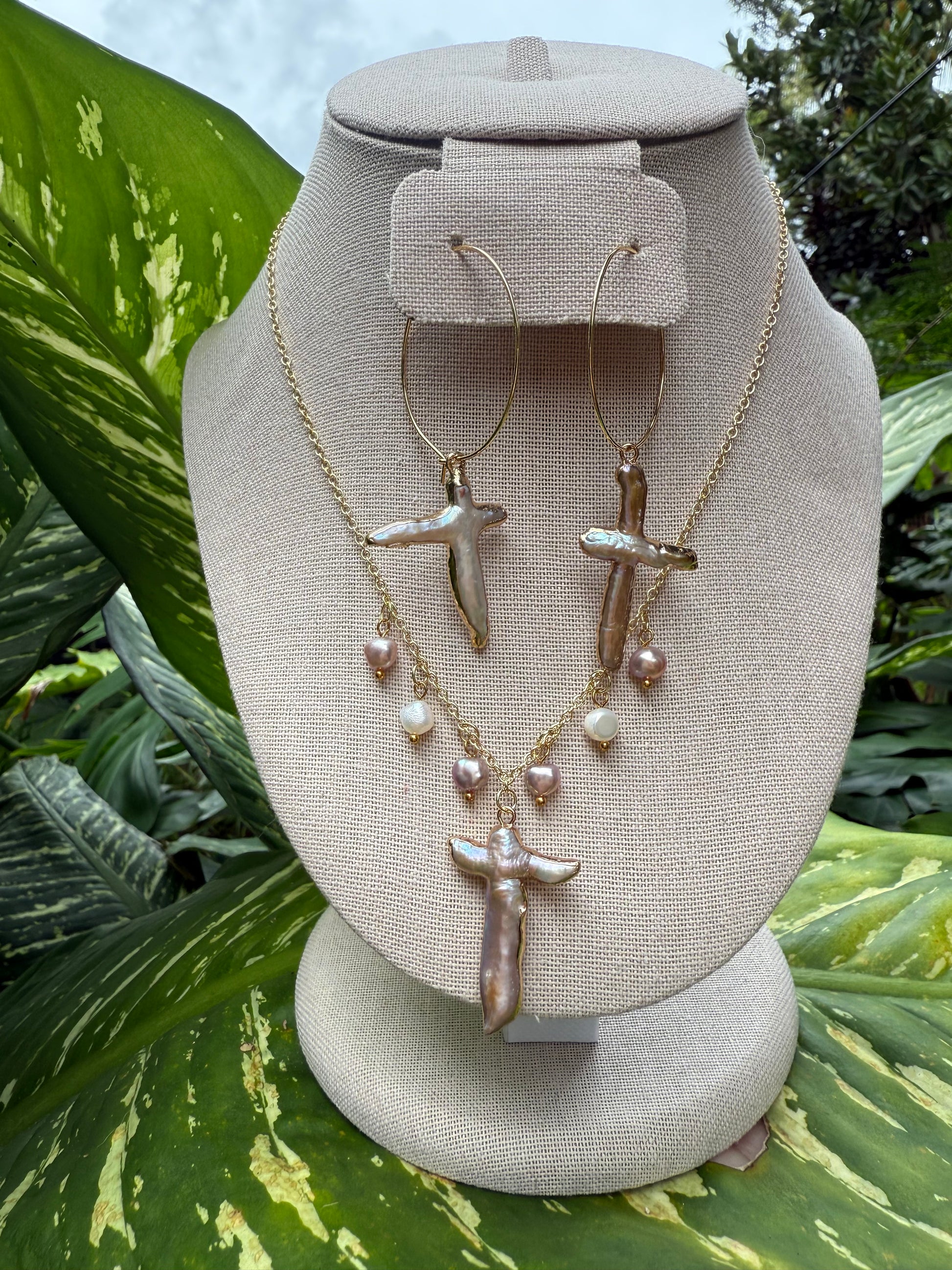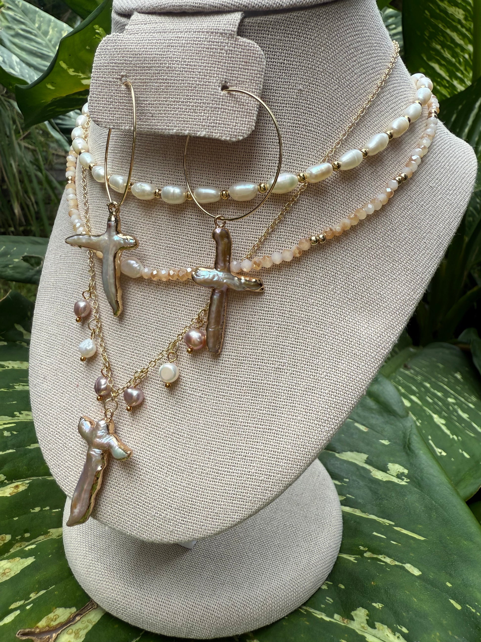 a: baroque freshwater pearl cross pendant with small freshwater pearl pendants on a 14k gold filled chain 16’ with a 2” extender